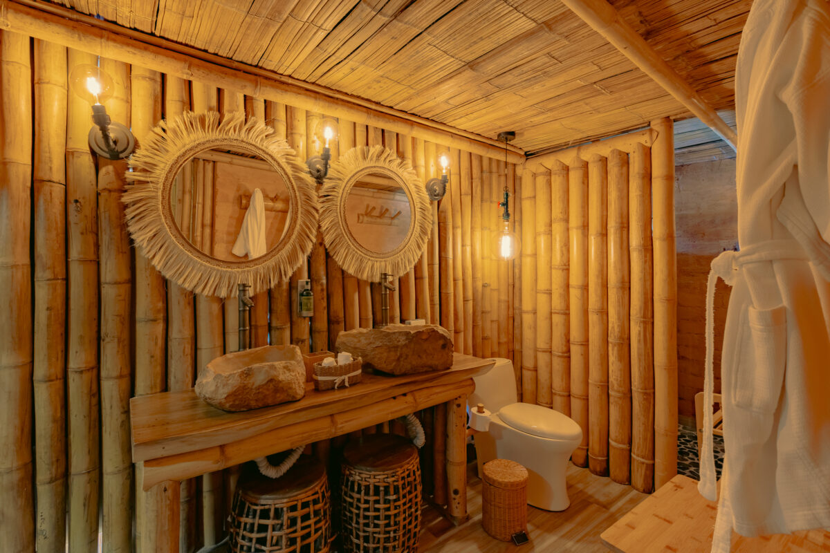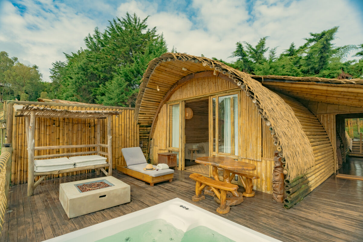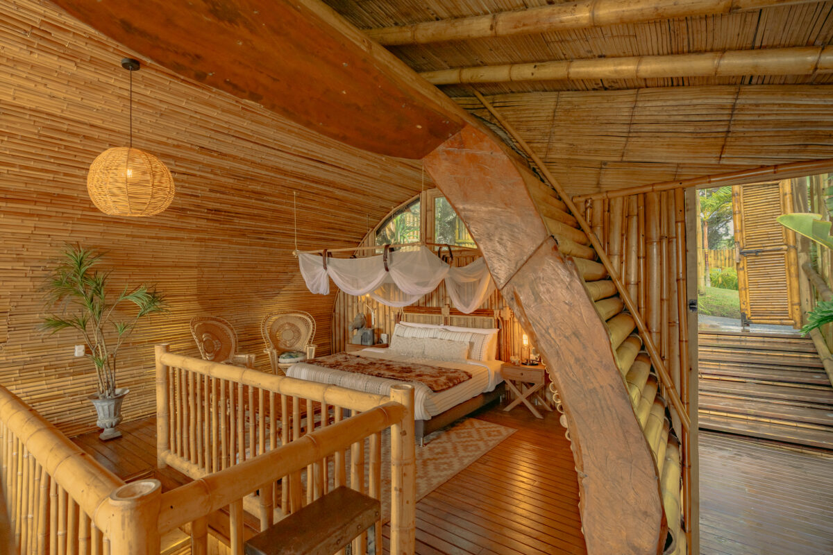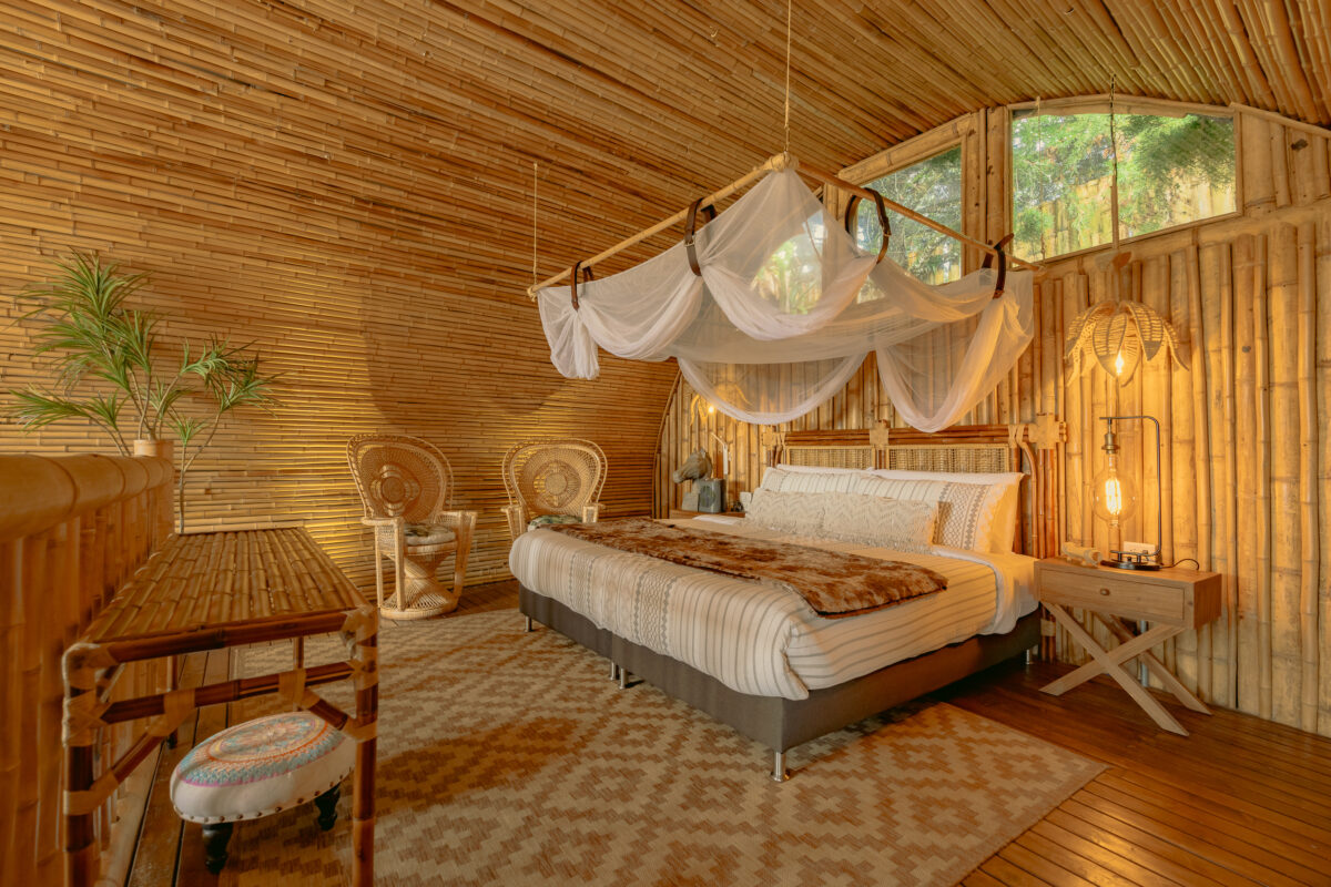 Un palacio íntimo de bambú con cama King, baño, jacuzzi y terraza privada. Ideal para celebrar el amor con vista al lago.