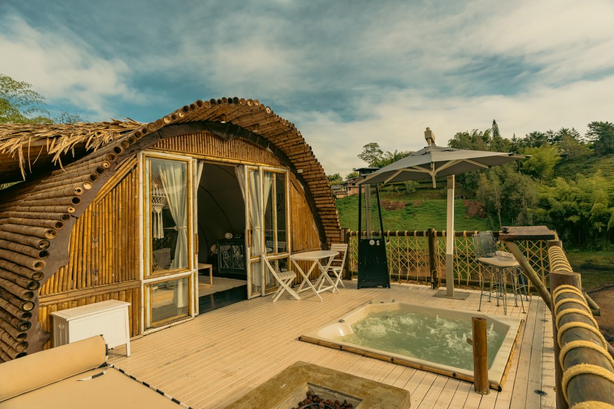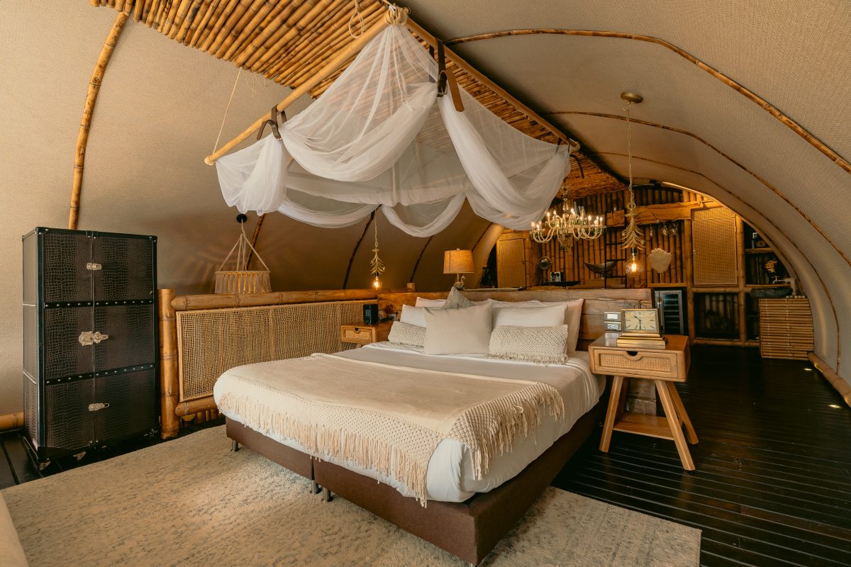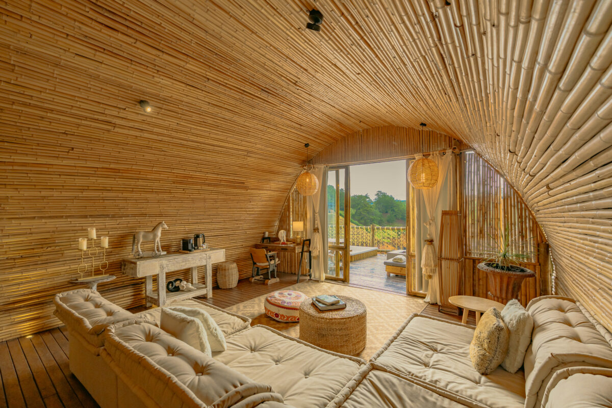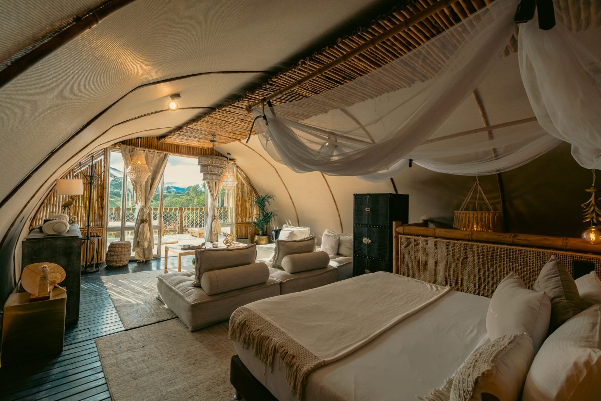 Un palacio íntimo de bambú con cama King, baño, jacuzzi y terraza privada. Ideal para celebrar el amor con vista al lago.