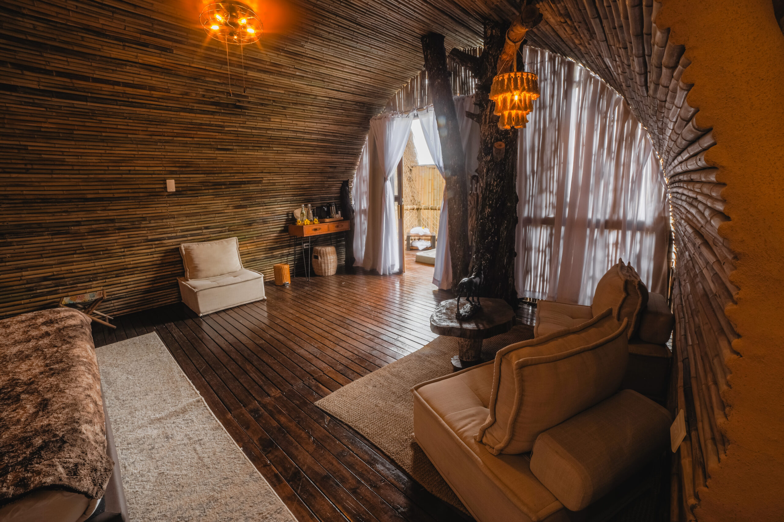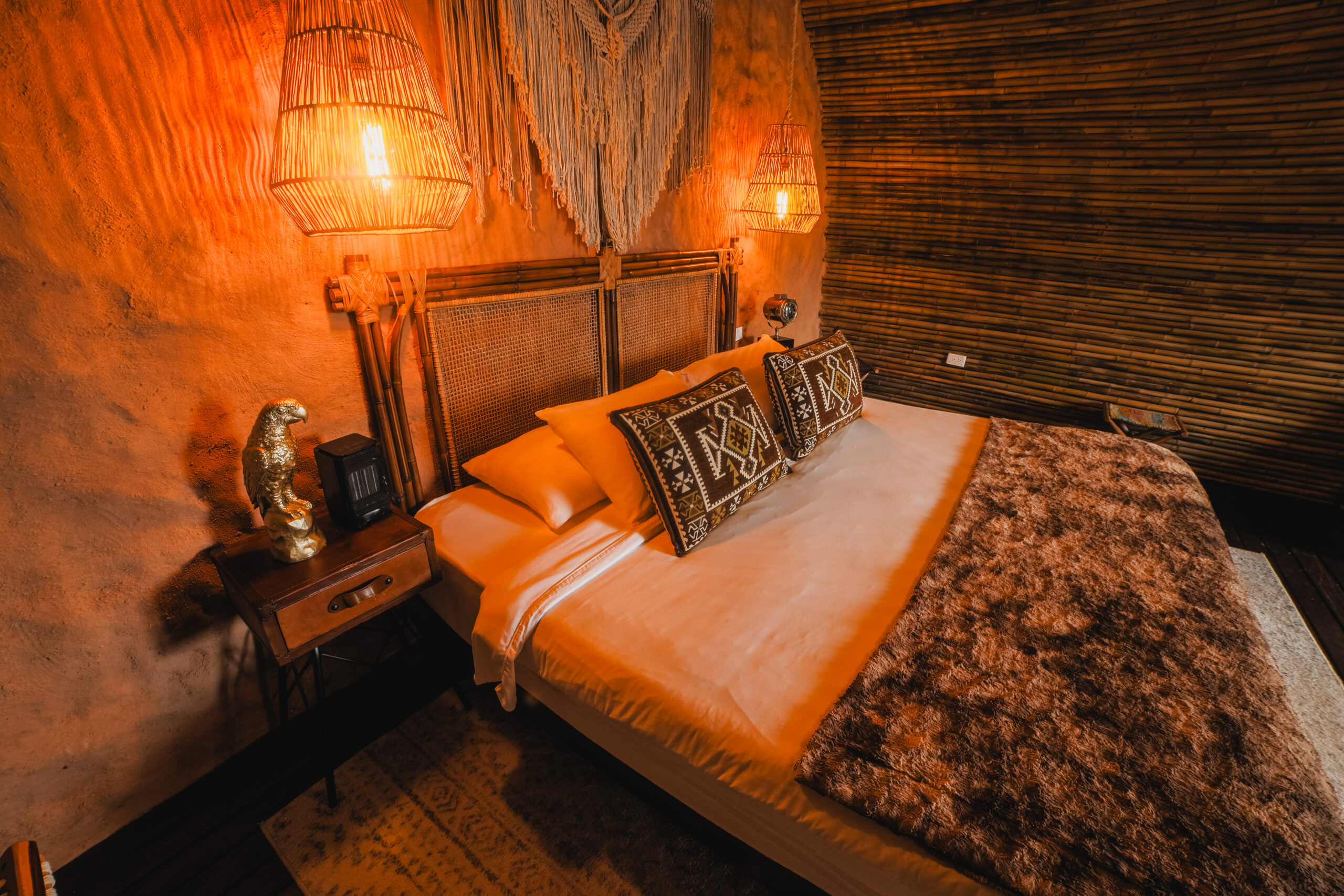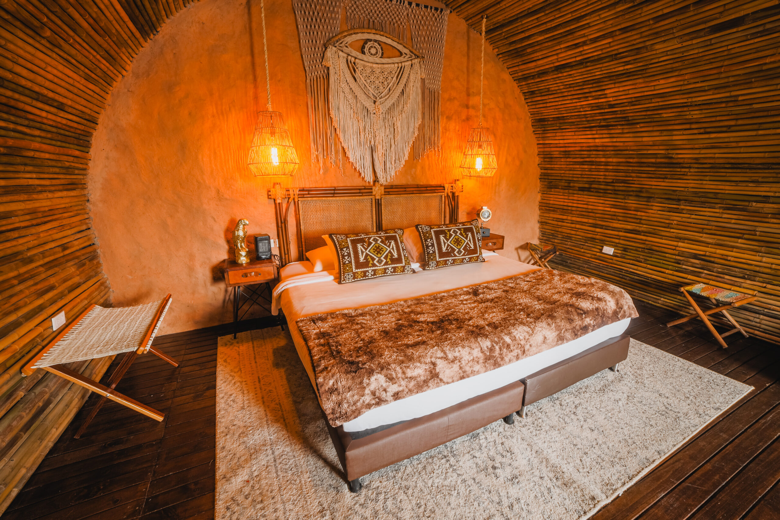 Diseñada para dos personas, esta villa de bambú ofrece una experiencia de descanso profunda, con una cómoda cama doble, baño privado con ducha caliente y una cafetera para disfrutar el primer café del día con vista al embals.